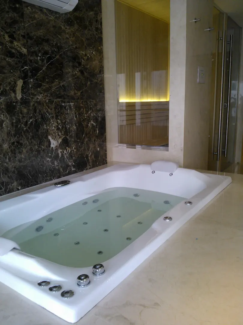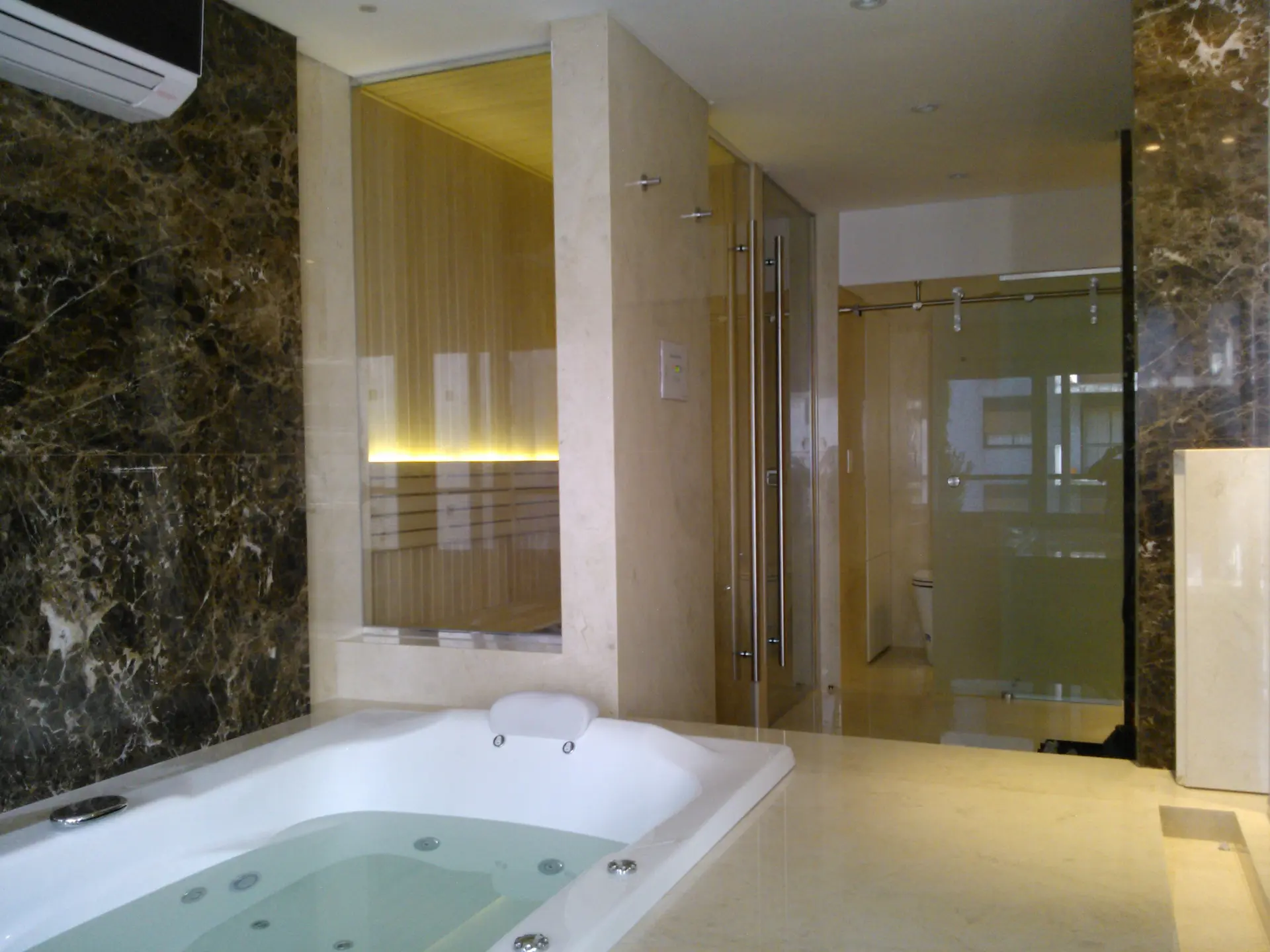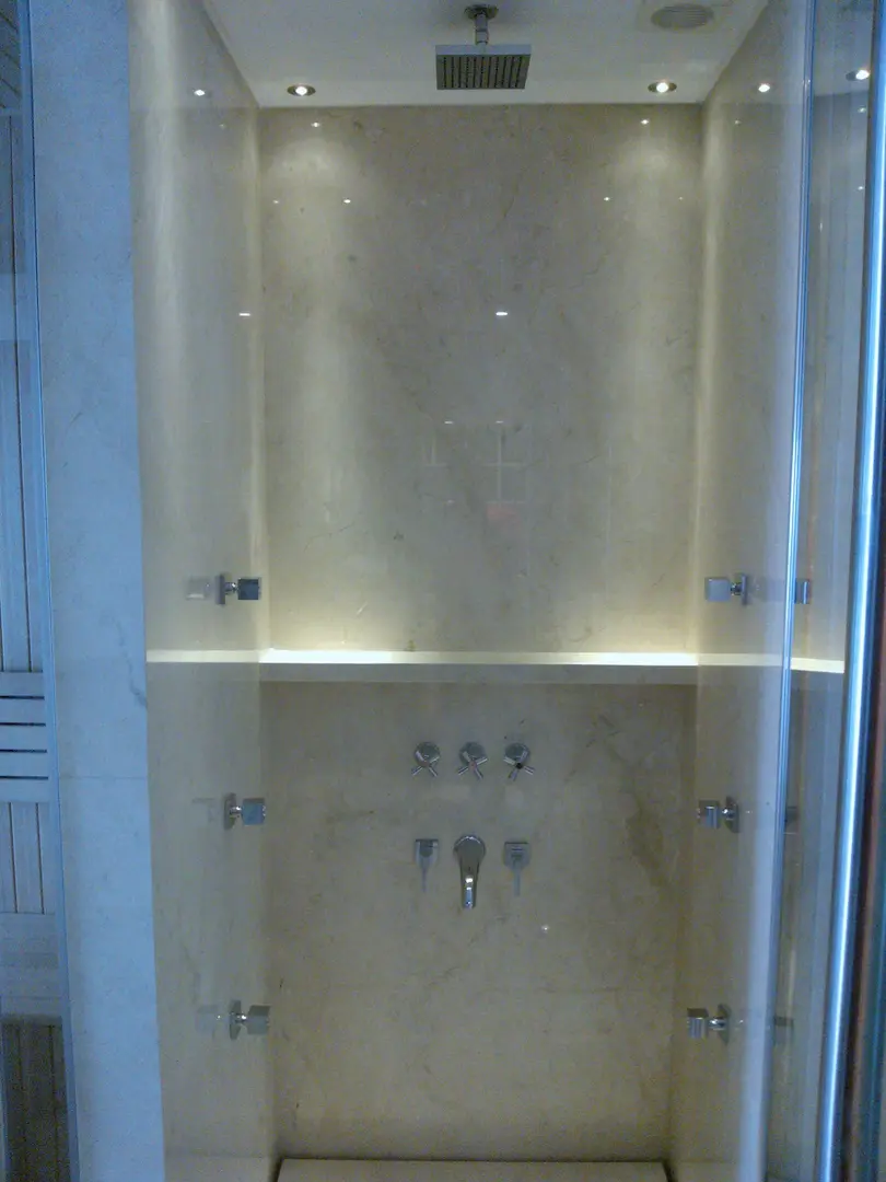 El proyecto planteaba el reto de integrar dos sistemas complejos —hidromasaje y sauna seco— en un espacio de baño principal, manteniendo una línea estética minimalista y lujosa. La dificultad residía en la gestión de las instalaciones en una etapa temprana de obra para asegurar que la maquinaria, el desagüe y las conexiones eléctricas quedaran embutidas y fueran accesibles para mantenimiento, sin afectar los revestimientos de mármol elegidos.