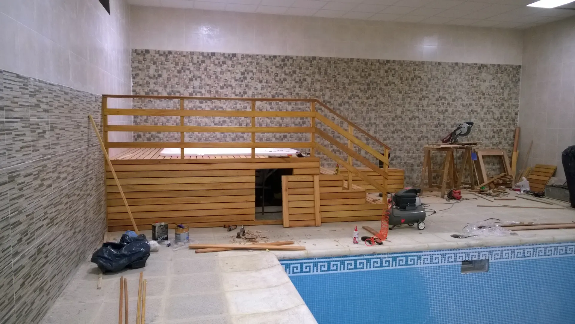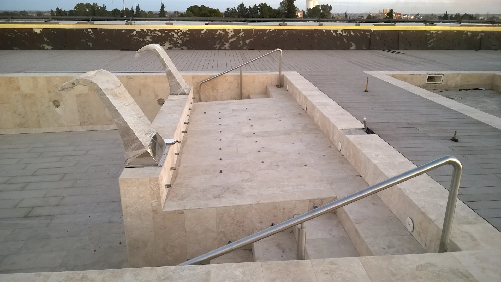 Obra Civil y Revestimientos: Ejecución de vasos de hormigón con terminaciones en piedra natural y sistemas de iluminación LED sincronizados.
